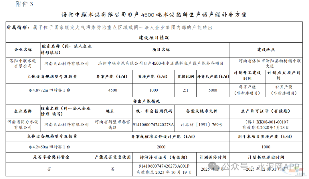 置換產(chǎn)能來自新安中聯(lián)萬基水泥有限公司2500t/d水泥熟料生產(chǎn)線(用于本項目置換產(chǎn)能1300t/d)。