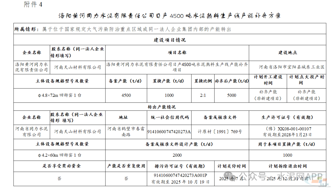 置換產(chǎn)能來自河南省同力水泥有限公司2000t/d熟料生產(chǎn)線(用于本項目置換產(chǎn)能1000t/d)。
