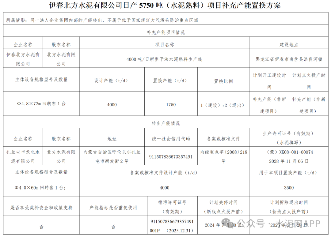 置換方案顯示,伊春北方水泥有限公司4000t/d熟料生產(chǎn)線補充產(chǎn)能1750t/d,補充后產(chǎn)能為5750t/d;退出產(chǎn)能來自扎蘭屯市龍北水泥有限公司(北方水泥子公司)4000t/d熟料生產(chǎn)線(用于本項目3500t/d),置換比例2:1。