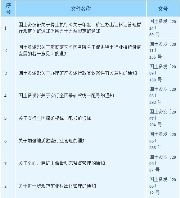 日前,《自然資源部第六批廢止的規(guī)范性文件目錄》公布,廢止16件涉及礦產(chǎn)資源管理的相關規(guī)范性文件(詳見下表)。