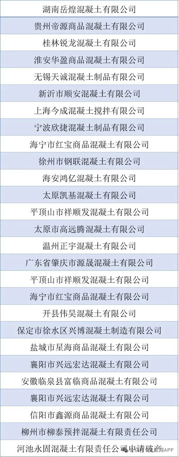 另據(jù)中國混凝土網(wǎng)報(bào)道,今年以來已有近30家混凝土企業(yè)被申請(qǐng)破產(chǎn),名單如下: