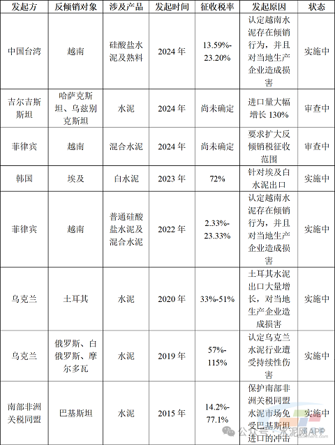 表1:2015-2025年期間全球范圍內(nèi)發(fā)起的水泥熟料反傾銷案例
