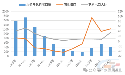 圖1:2015-2025年上半年中國水泥及熟料出口情況(單位:萬噸,%)
