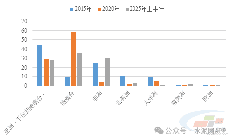 與此同時(shí),中國大陸對(duì)中國港澳臺(tái)地區(qū)的水泥及熟料出口占比大幅上升,2025年上半年占出口總量的35%左右;出口到非洲的水泥及熟料占比同樣呈現(xiàn)上升趨勢,2025年上半年占比接近30%,相較于2015年上升了超過5個(gè)百分點(diǎn);另外,中國水泥及熟料出口到南美洲以及歐洲的比例也略有增加。