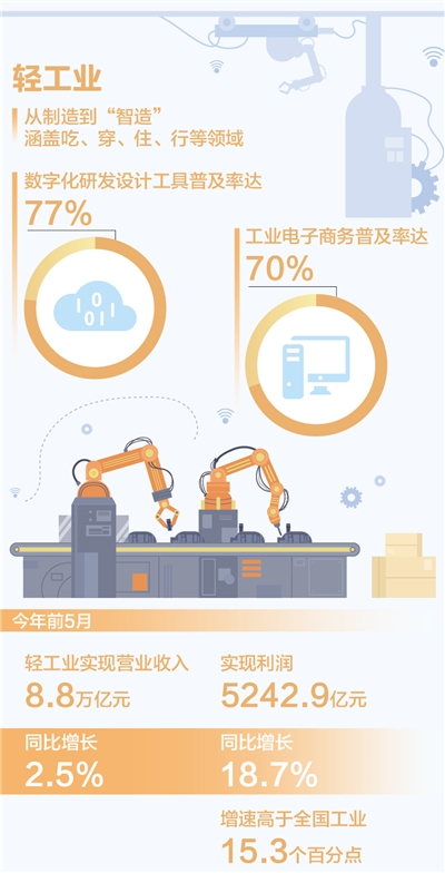 不只陶瓷業(yè),新一輪技術(shù)革命和產(chǎn)業(yè)變革深入推進(jìn),數(shù)字化智能化成為輕工業(yè)轉(zhuǎn)型升級的主攻方向。“作為國民經(jīng)濟(jì)的傳統(tǒng)優(yōu)勢產(chǎn)業(yè)和重要民生產(chǎn)業(yè),輕工業(yè)涵蓋吃、穿、住、行等領(lǐng)域?!敝袊p工業(yè)聯(lián)合會會長張崇和說,輕工業(yè)加快轉(zhuǎn)型升級、提質(zhì)增效。今年前5月,輕工業(yè)實(shí)現(xiàn)營業(yè)收入8.8萬億元,同比增長2.5%,實(shí)現(xiàn)利潤5242.9億元,同比增長18.7%,增速高于全國工業(yè)15.3個百分點(diǎn)。