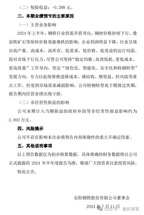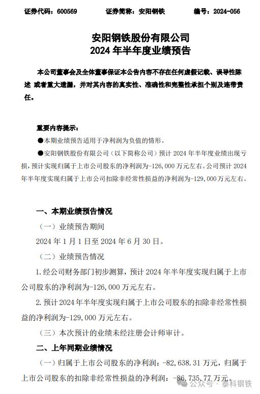 7月11日安陽鋼鐵公告,預(yù)計(jì)2024年半年度凈虧損12.6億元左右。公告稱:2024 年上半年,鋼鐵行業(yè)供需矛盾突出,鋼材價(jià)格持續(xù)下行,疊 加鐵礦石等原料價(jià)格易漲難跌的影響,企業(yè)利潤(rùn)明顯下降,行業(yè)呈現(xiàn) 出高產(chǎn)量、高成本、高庫存、低需求、低價(jià)格、低效益的運(yùn)行局面。面對(duì)市場(chǎng)下行壓力,盡管公司堅(jiān)持“穩(wěn)定均衡、高效低耗、更低成本、 更高質(zhì)量”工作導(dǎo)向,堅(jiān)定“綠色化、智能化、安全化和特鋼轉(zhuǎn)型” 發(fā)展方向,全力以赴統(tǒng)籌推進(jìn)降成本、調(diào)結(jié)構(gòu)、增效益、控風(fēng)險(xiǎn)等重 點(diǎn)工作,但受到市場(chǎng)需求減弱影響,公司特鋼轉(zhuǎn)型處于爬坡過坎期, 報(bào)告期內(nèi)經(jīng)營(yíng)業(yè)績(jī)出現(xiàn)虧損。