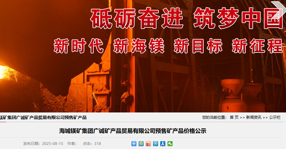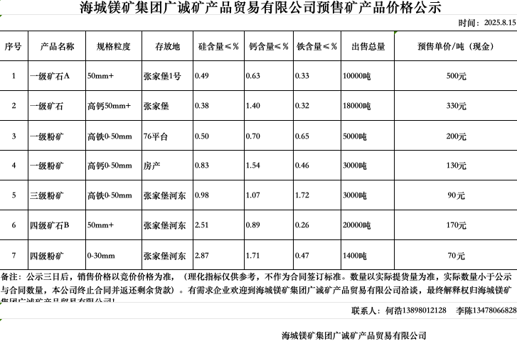 海城鎂礦集團(tuán)廣誠(chéng)礦產(chǎn)品貿(mào)易有限公司預(yù)售礦產(chǎn)品價(jià)格公示