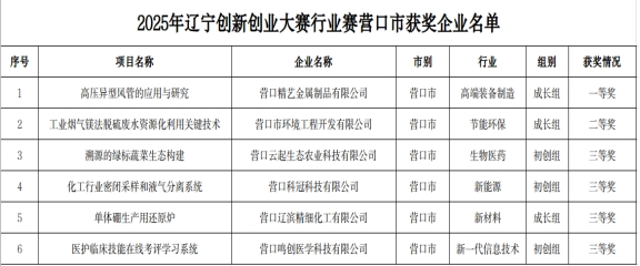 此次賽事中,營口參賽企業(yè)聚焦細(xì)分領(lǐng)域深耕細(xì)作,多個(gè)項(xiàng)目憑借技術(shù)創(chuàng)新性、市場(chǎng)應(yīng)用價(jià)值及產(chǎn)業(yè)化前景獲得評(píng)委認(rèn)可。其中,營口精藝金屬制品有限公司的“高壓異型風(fēng)管的應(yīng)用與研究”項(xiàng)目,特殊材質(zhì)滿足超低溫要求,適配高端裝備制造等特殊場(chǎng)景需求,填補(bǔ)國家空白;營口市環(huán)境工程開發(fā)有限公司的“工業(yè)煙氣鎂法脫硫廢水資源化利用關(guān)鍵技術(shù)”,為環(huán)保領(lǐng)域破解廢水處理難題、實(shí)現(xiàn)資源循環(huán)提供新路徑;營口云起生態(tài)農(nóng)業(yè)科技有限公司“溯源的綠標(biāo)蔬菜生態(tài)構(gòu)建”項(xiàng)目,搭建農(nóng)產(chǎn)品全鏈條質(zhì)量追溯體系,助力農(nóng)業(yè)高質(zhì)量發(fā)展;營口鳴創(chuàng)醫(yī)學(xué)科技有限公司的“醫(yī)護(hù)臨床技能在線考評(píng)學(xué)習(xí)系統(tǒng)”項(xiàng)目,為醫(yī)療領(lǐng)域人才培養(yǎng)與技能考評(píng)提供數(shù)字化解決方案;營口科冠科技有限公司“化工行業(yè)密閉采樣和液氣分離系統(tǒng)”、營口遼濱精細(xì)化工有限公司“單體硼生產(chǎn)用還原爐”項(xiàng)目,則分別在化工安全升級(jí)、高端材料制造設(shè)備優(yōu)化上展現(xiàn)技術(shù)優(yōu)勢(shì)。