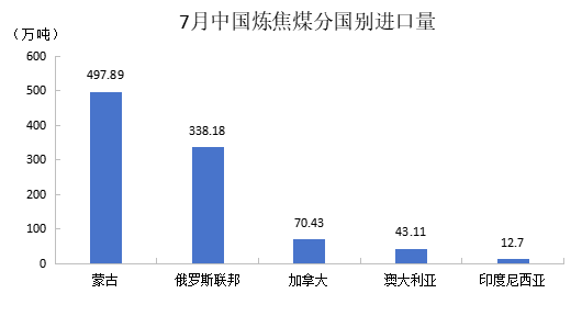 7月份,我國進(jìn)口煉焦煤962.3萬噸,環(huán)比增長5.65%(51.46萬噸),但同比下降11.2%(121.83萬噸)。1-7月累計進(jìn)口煉焦煤6248.23萬噸,同比累計下降8.42%(574.48萬噸)。分國別看,排名靠前的國家是蒙古國(497.89萬噸)、俄羅斯(338.18萬噸)、加拿大(70.43萬噸)、澳大利亞(43.11萬噸)。
